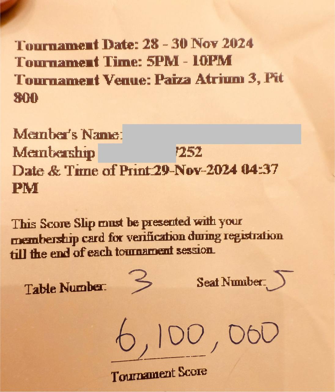 เราเล่นจนครบ 6 เกมส์ตามกติกาแทงขั้นต่ำที่ 50,000 ต่อเปิด ซึ่งเราแทงไม่ผิดเลยแต่แทงน้อย ชิปรวมได้สูงสุดแค่ 3,750,000 เท่านั้นเสียดาถ้ายกสีเปิดละ 1 ล้านคงจะได้มีเงินไม่ต่ำกว่าเกือบ 10 ล้านแน่ๆ แต่ตั้งใจว่าแค่นี้พอก่อนเลยได้ผลมาอย่างที่เห็นว่าในกระดานเราอยู่อันดับที่ 14 เท่านั้น